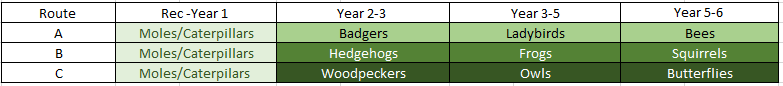 Route A – Moles/Caterpillars → Badgers → Ladybirds → Bees